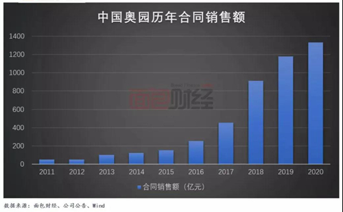 2020年,盡管有疫情的影響,中國奧園再次實(shí)現(xiàn)合同銷售額創(chuàng)下歷史新高,達(dá)到1330.1億元,同比增長13%。對比來看,2020年國內(nèi)商品房銷售額約為17.36萬億元,同比增長8.7%。由此可見,中國奧園2020年合同銷售額的增速明顯快于行業(yè)整體增速。