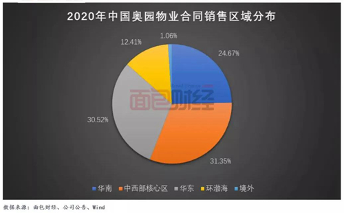 經(jīng)過持續(xù)的積累,中國奧園目前已完成全國化布局。在公司2020年物業(yè)合同銷售區(qū)域分布中,華南、中西部核心區(qū)、華東的銷售額分別為328.10億元、417.00億元、405.90億元,分別占比24.67%、31.35%和30.52%,整體分布較為均勻,有助于提升公司抗風(fēng)險(xiǎn)能力。