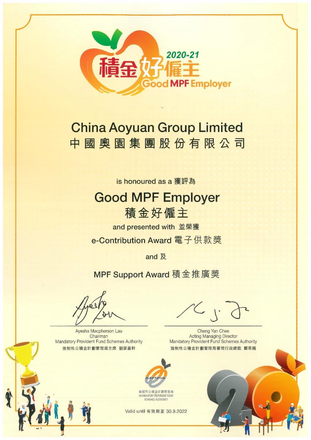 8月26日,中國奧園獲香港強制性公積金計劃管理局頒發2020-2021年度 “積金好雇主”嘉許、“電子供款獎”及“積金推廣獎”。香港強制性公積金(“強積金”)制度是香港退休保障制度的第二支柱,以監管由私營機構管理及具備足額資金的強制性供款計劃,“積金好雇主”嘉許計劃旨在促進雇主履行強積金責任。符合聯合國可持續發展目標8:體面工作和經濟增長。