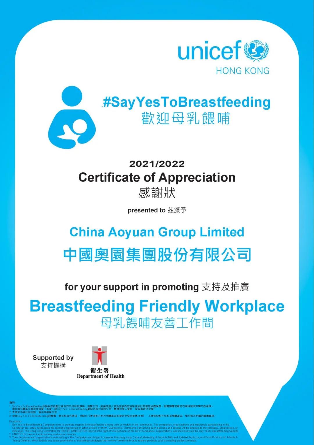 聯合國兒童基金香港委員會“母乳喂哺友善工作間”認證