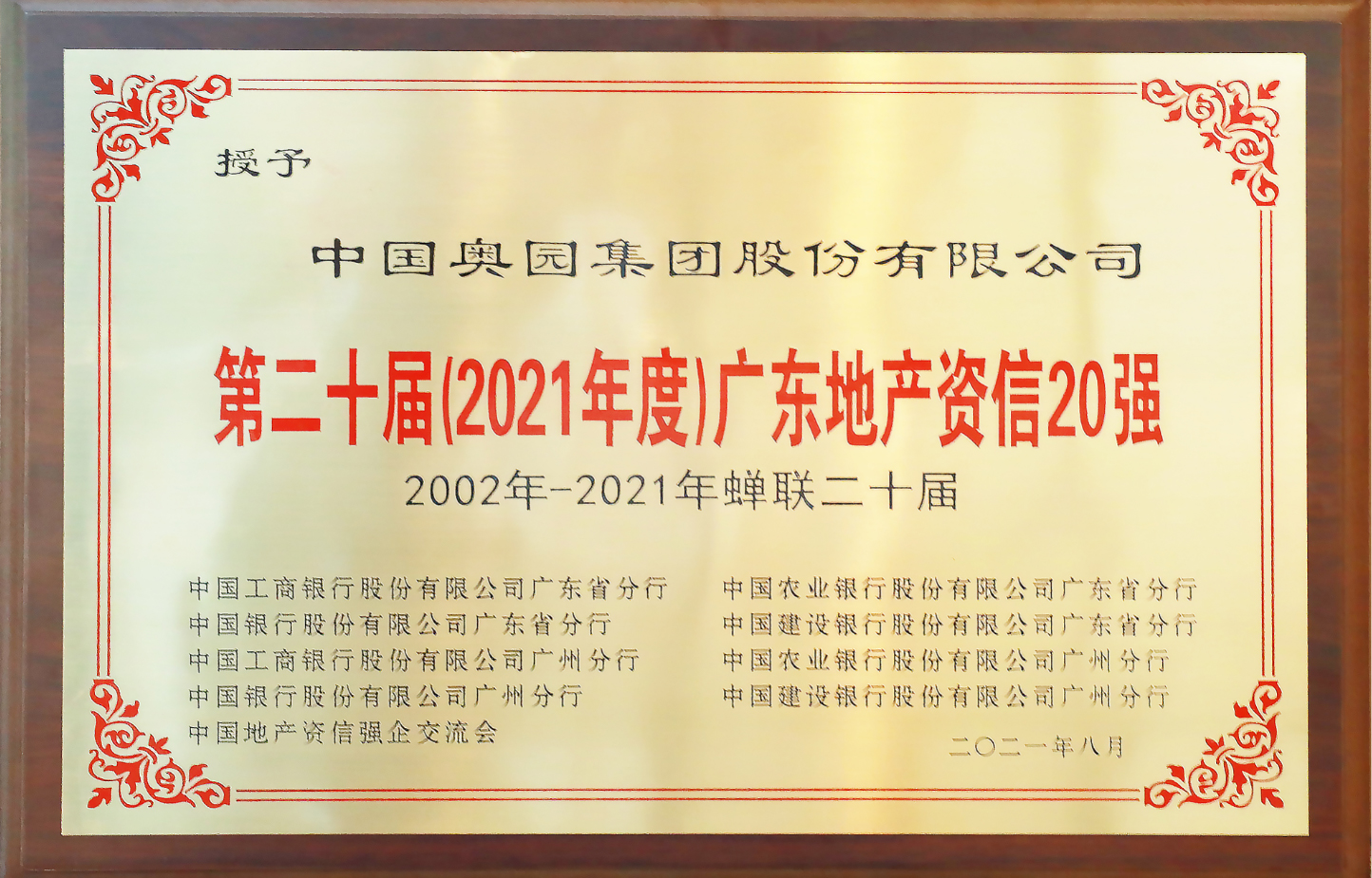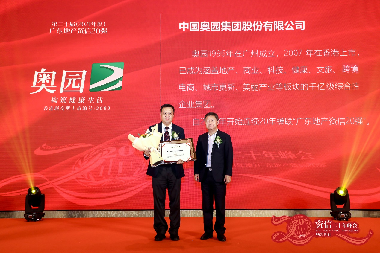 9月17日,在“資·信”二十年峰會暨“第二十屆(2021年度)廣東地產資信20強”頒獎典禮上,中國奧園憑借一貫卓越的資信記錄、企業信譽和綜合實力,獲評“第二十屆(2021年度)廣東地產資信20強”。這是中國奧園連續20年蟬聯此項榮譽稱號。