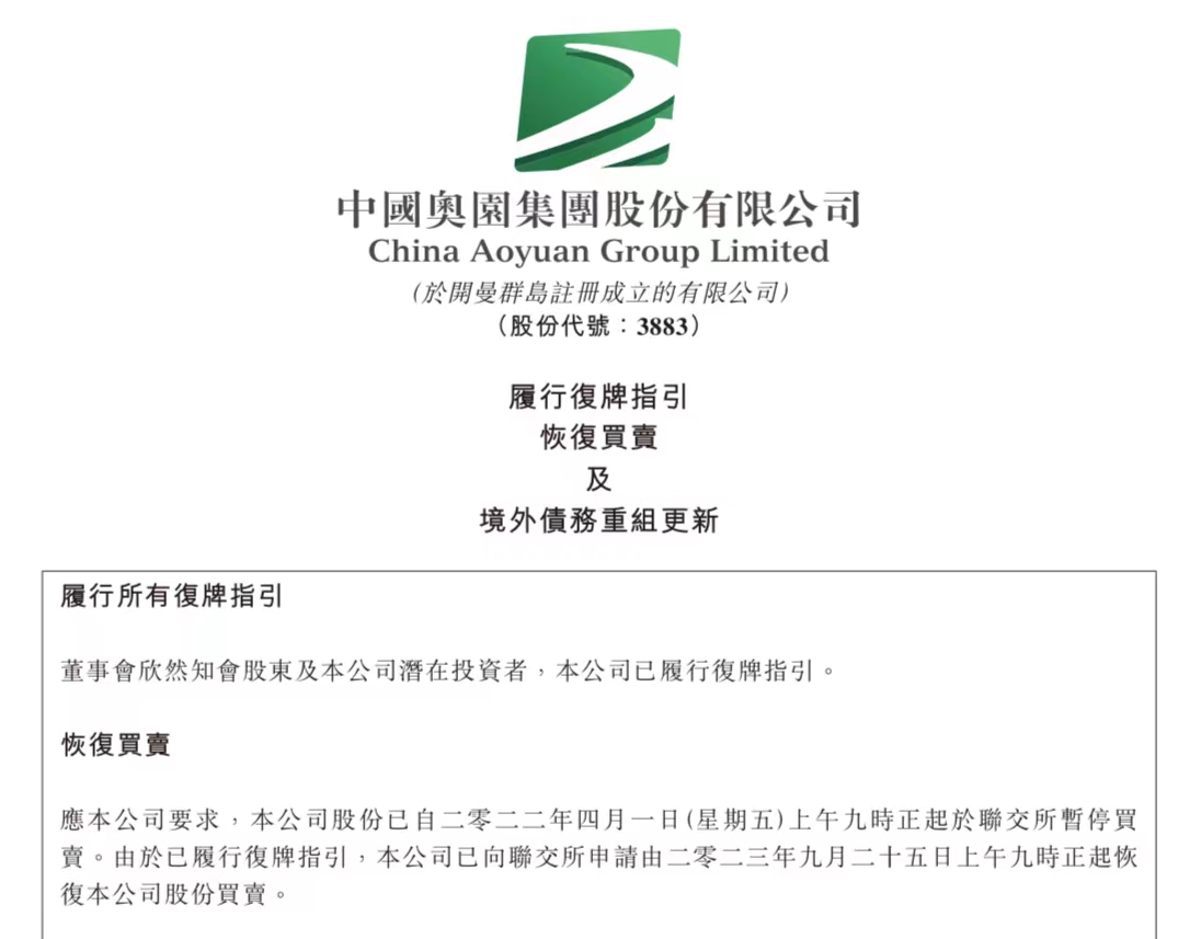 9月22日晚,中國奧園集團(03883.HK)發布公告,已完成全部復牌指引相關工作,將于9月25日上午9時起正式在香港聯交所恢復股票交易。
